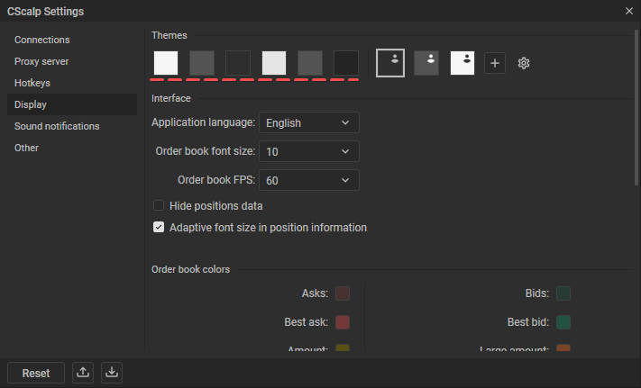 We have implemented three user-customizable color schemes in CScalp. We have also reintroduced the color theme that was present in the terminal before the redesign. You can configure the color scheme here: